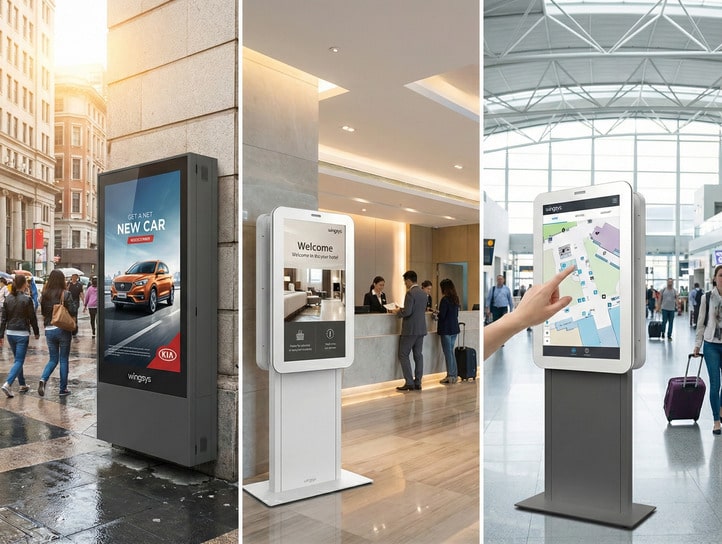 Tanto os modelos de interior como os de exterior podem integrar tecnologia touchscreen, o que reforça o seu valor enquanto ferramentas de marketing e apoio ao cliente.