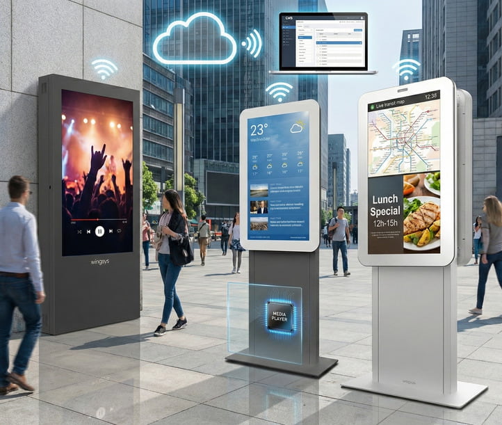 • o hardware, também designado media player, um pequeno computador integrado que armazena e processa os conteúdos exibidos no ecrã;