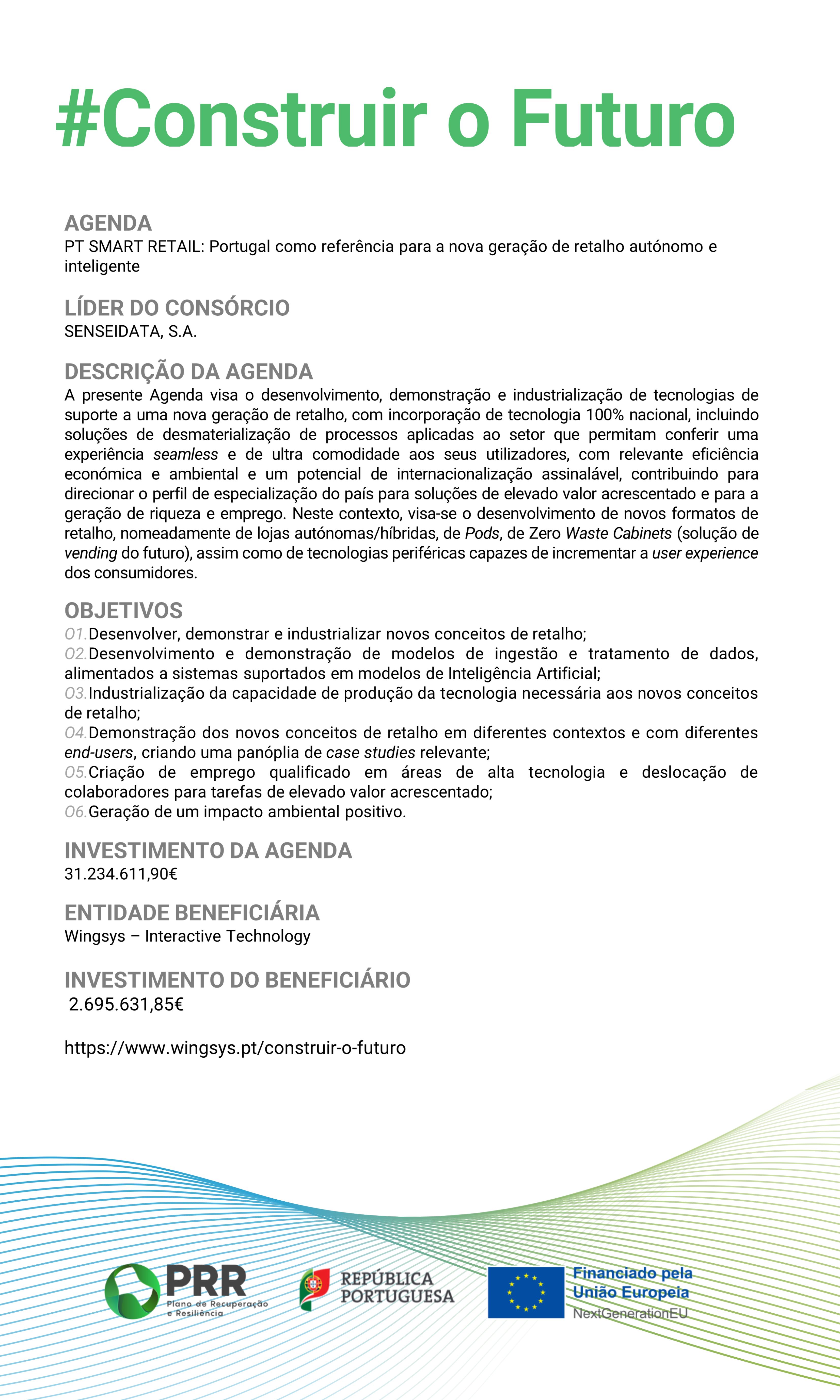 El consorcio PT Smart Retail, en el que participa Wingsys, fue aprobado por el Comité de Coordinación de la Agenda (PRR) con una inversión de más de 30 millones de euros. Bajo el lema #ConstruiroFuturo y con Senseidata S.A. como líder, esta agenda reúne a 22 entidades (19 promotores + 3 socios) de diferente naturaleza y sectores, con el objetivo de desarrollar, demostrar e industrializar tecnologías para apoyar una nueva generación de retail, con incorporación de tecnología 100% nacional, incluyendo soluciones de desmaterialización de procesos aplicadas al sector que brindan una experiencia fluida y ultra cómoda a sus usuarios.