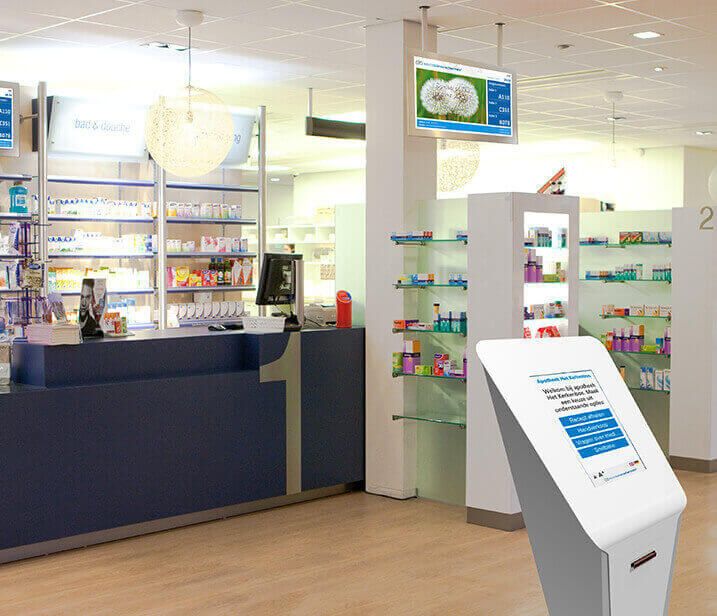 Resultados: Graças aos quiosques interativos Wingsys IT005C, o atendimento é feito de forma digital, permitindo uma gestão otimizada de filas de espera nas farmácias holandesas.